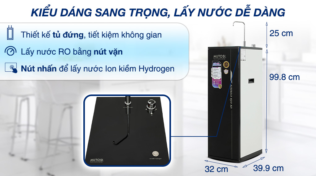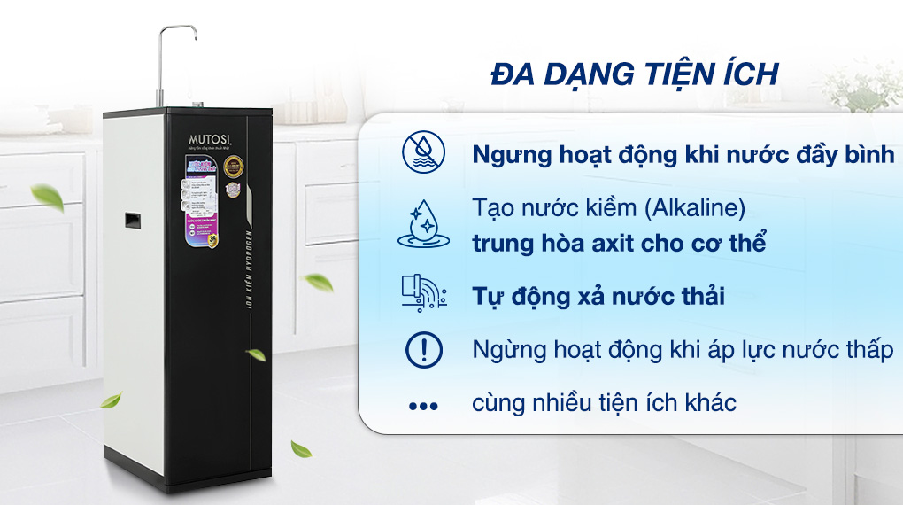Máy lọc nước RO Hydrogen ion kiềm Mutosi MP-S1001H 10 lõi thiết kế dạng tủ đứng hiện đại, có thể tạo ra nguồn nước ion kiềm Hydrogen tốt cho sức khỏe, công suất lọc tới 20 lít/giờ kèm nhiều tính năng hữu ích, đây chắc chắn là một lựa chọn tốt cho mọi gia đình Việt.