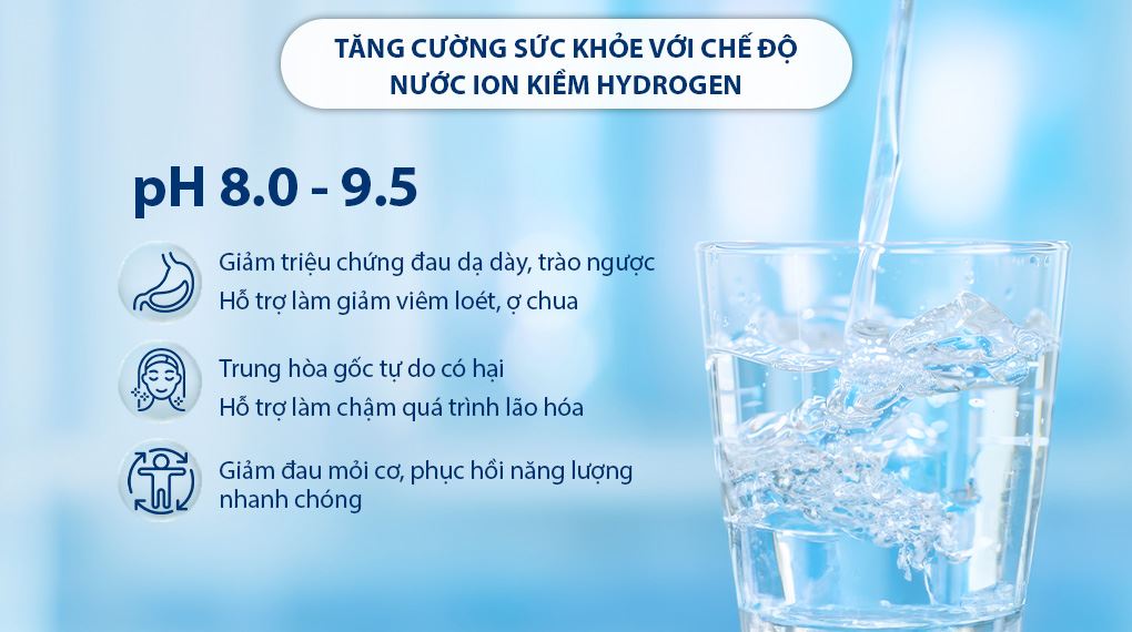 + Chế độ ion kiềm Hydrogen có pH 8.0 - 9.5, ORP -325 đến -600 mV và Hydrogen 650 - 1200 ppb.
