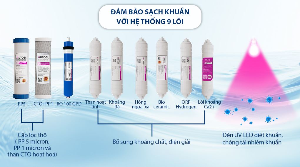 Hệ thống lọc 9 lõi đa tầng với các công dụng khác nhau, kèm theo cấp lọc đèn UV LED (diệt khuẩn bằng tia UV - sóng điện từ, không tốn chi phí thay lõi). Được chia làm 3 cấp lọc (cấp lọc thô, cấp lọc tinh và cấp lọc bù khoáng), gồm: