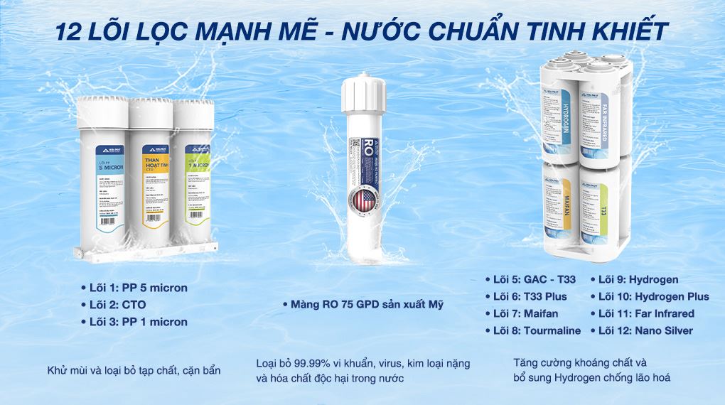 - Lõi RO 75 GPD (Sx Mỹ): Loại bỏ 99.99% vi khuẩn, vi rút, kim loại nặng, hóa chất độc hại có kích thước lên đến 0.0001 micron giúp nước trở nên tinh khiết.