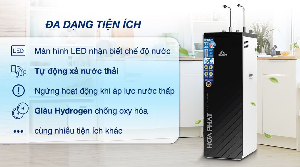 - Máy lọc nước Hòa Phát HPN639 với thiết kế tủ đứng hiện đại, thân máy thon gọn cùng màn hình LED giúp người dùng dễ dàng nhận biết chế độ nước, tô điểm thêm cho không gian sống.