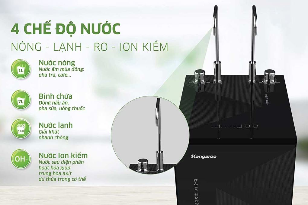 Sản phẩm tạo được 4 loại nước gồm nước ion kiềm Hydrogen và nước tinh khiết ở 3 mức nhiệt nóng, nguội, lạnh. Cách phân chia này khá thực tế vì người dùng có thể uống trực tiếp, pha đồ uống, dùng cho sinh hoạt hằng ngày hoặc lựa chọn nước ion kiềm theo nhu cầu riêng.