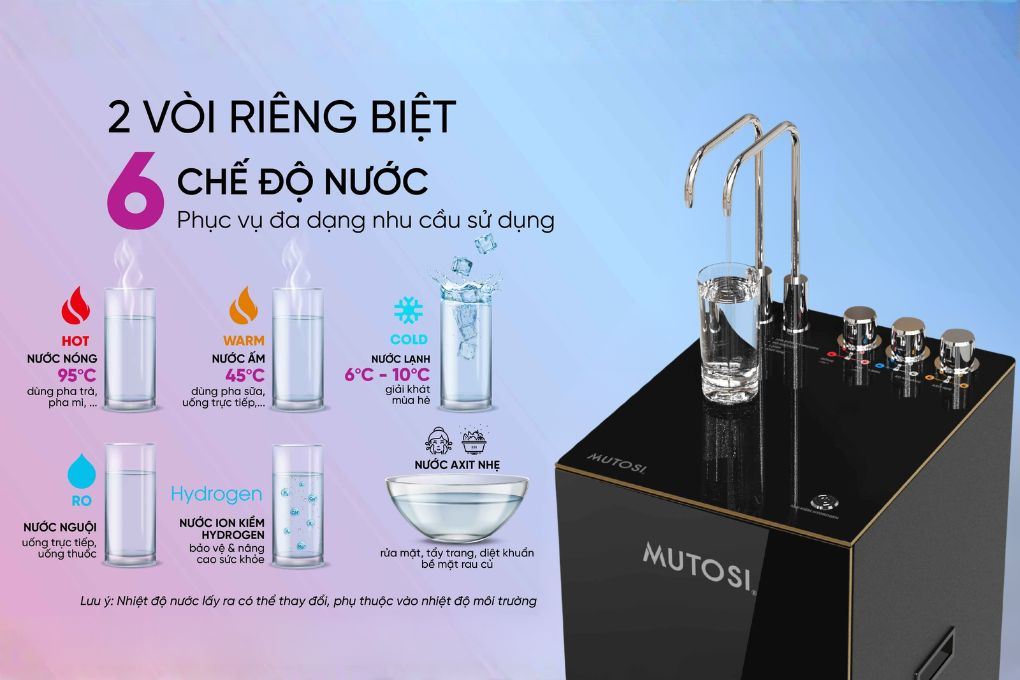 Máy lọc nước RO nóng nguội lạnh Hydrogen ion kiềm Mutosi MP-P88N 10 lõi với 2 vòi riêng biệt 6 loại nước dùng hằng ngày, từ uống đến rửa rau, giúp linh hoạt hơn trong sinh hoạt gia đình.