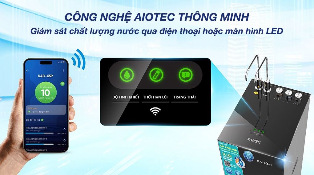 Sở hữu Karofi KAD-X59 là lựa chọn thông minh cho lối sống hiện đại và khỏe mạnh. Sản phẩm nổi bật với hệ thống 12 lõi lọc Smax gấp đôi hiệu suất, màng RO 50 GPD chuẩn Mỹ, bộ đôi lõi chức năng bổ sung Hydrogen và vi khoáng, giúp tạo ra nguồn nước không chỉ sạch mà còn tốt cho sức khỏe. Bên cạnh đó, công nghệ AioTec giám sát thông minh, chế độ nóng nhanh - lạnh sâu cùng thiết kế sang trọng sẽ mang đến trải nghiệm tiện nghi và an tâm cho cả gia đình mỗi ngày.