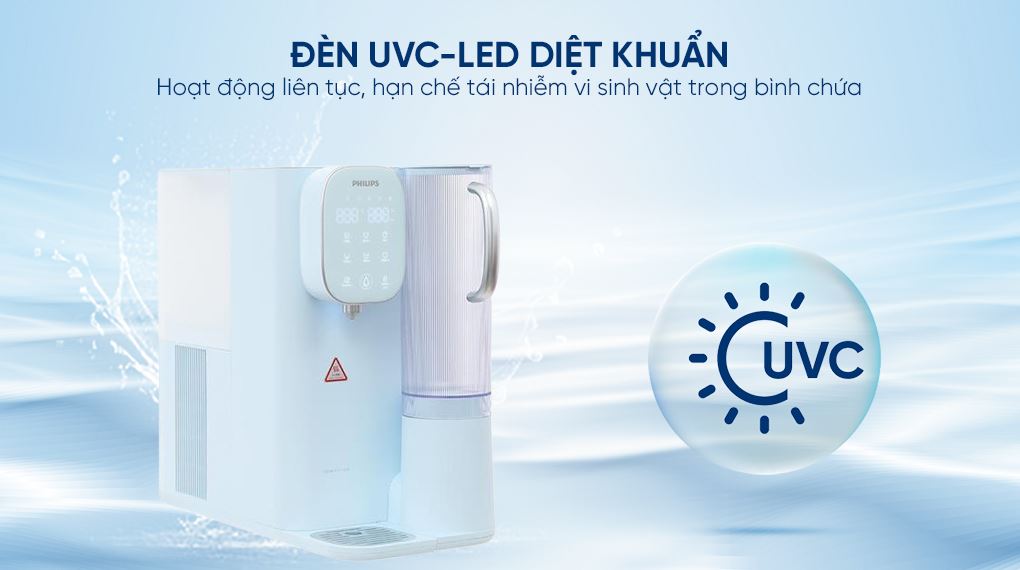 - Đèn UVC-LED hoạt động liên tục trong quá trình lấy nước, giúp hạn chế tái nhiễm khuẩn trong bình chứa.
