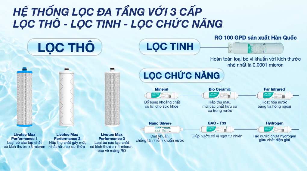 - Livotec là dòng máy lọc nước hiệu suất cao nhờ công nghệ lọc Max Perfomance, giúp tăng gấp 1.5 hiệu suất lọc và gấp 1.5 tuổi thọ lõi lọc so với các máy lọc nước thông thường. Công nghệ hiện đại, nhiều dòng máy: Nóng-Lạnh-Nguội; Nóng-Nguội, RO thỏa mãn nhu cầu đa dạng của người tiêu dùng.
