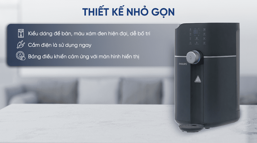 Máy lọc nước RO nóng nguội Philips ADD6910DG/90 1 lõi thiết kế nhỏ gọn để bàn, sử dụng ngay không cần lắp đặt. Trang bị lõi lọc RO 5 tầng mạnh mẽ, làm nóng nước nhanh với 3 mức nhiệt, tích hợp đèn UVC-LED khử khuẩn và nhiều tiện ích thông minh cho gia đình.