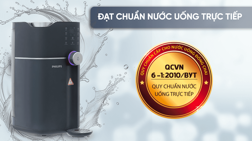 - Máy lọc nước cung cấp nước tinh khiết đạt chuẩn uống trực tiếp theo QCVN 6-1:2010/BYT nhờ hệ thống lọc RO 5 trong 1 và công nghệ diệt khuẩn bằng đèn UVC-LED, đáp ứng tốt cho nhu cầu sử dụng nước thường, nước ấm và nước nóng mỗi ngày.