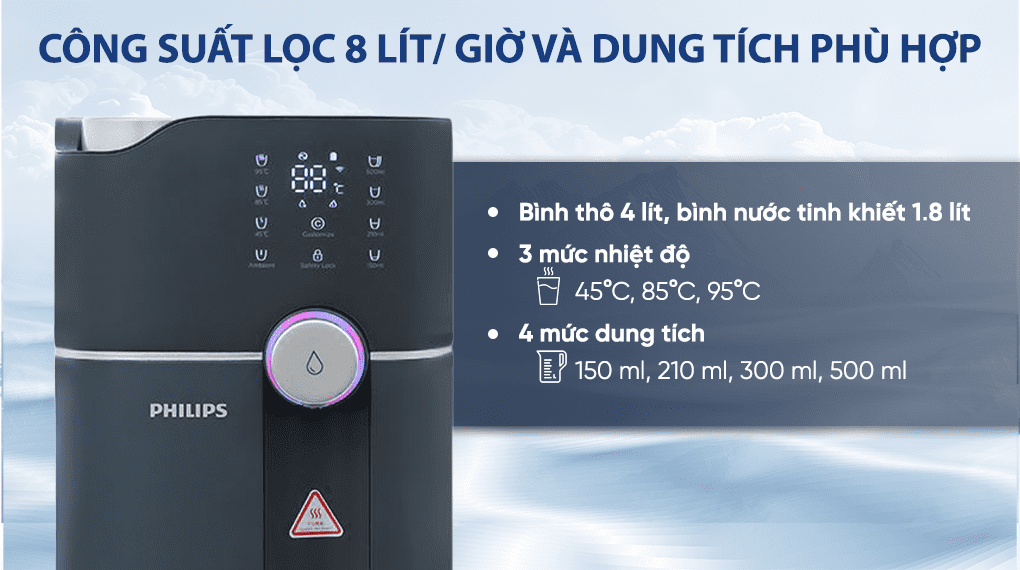 Ngoài ra, người dùng có thể chọn lượng nước cần lấy với 4 mức dung tích: 150 ml, 210 ml, 300 ml và 500 ml, phù hợp cho từng nhu cầu sử dụng.