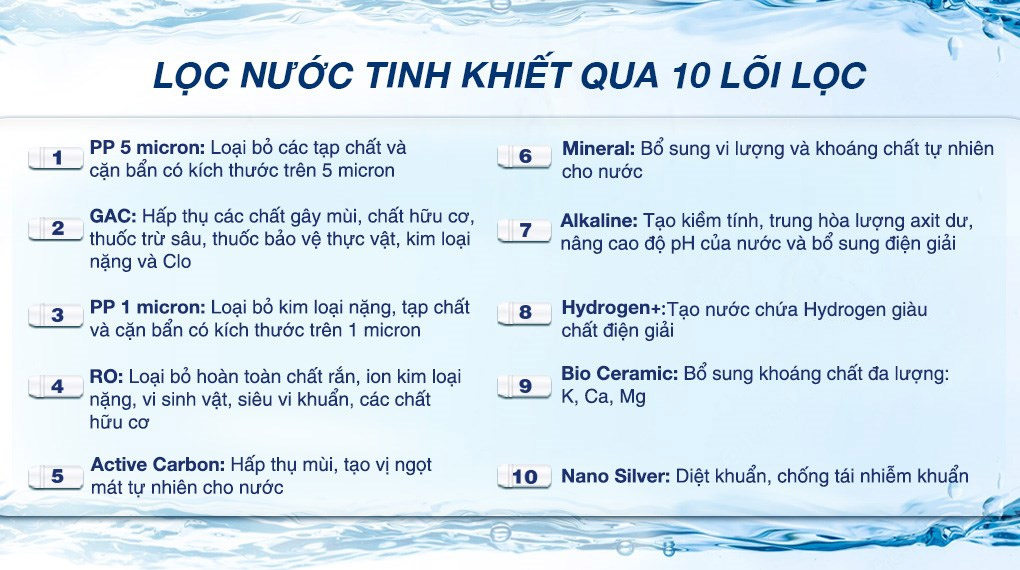 Lõi RO (Sx Hàn Quốc): Loại bỏ hoàn toàn chất rắn, ion kim loại nặng, vi sinh vật, siêu vi khuẩn, các chất hữu cơ,...