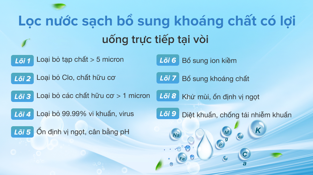 - Lõi Hydrogen: Khử mùi và các chất hữu cơ, làm cho nước có mùi vị ngọt mát tự nhiên.