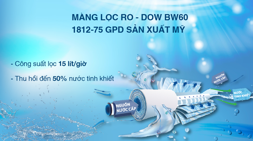 - Lọc được cả nguồn nước nhiễm mặn, lợ có chỉ số TDS < 1500 ppm.