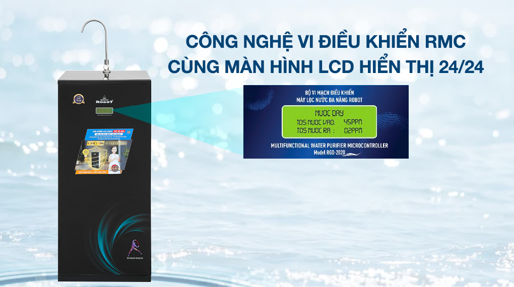 - Công nghệ RMC phối hợp màn hình LCD đa ngôn ngữ Việt, Anh, Nga, Nhật, Hàn, Trung hiển thị 24/24: tất cả mọi hoạt động của máy đều được hiển thị trên màn hình như: máy đang sục rửa màng lọc RO, nước đầy, đang thiếu nước đầu vào, kiểm tra rò rỉ nước, kiểm tra lõi lọc,... giúp bạn dễ dàng quan sát mọi hoạt động của máy.