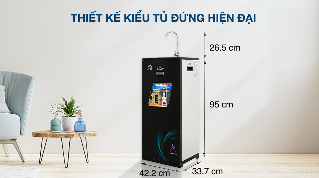 - Máy lọc nước ROBOT được thiết kế dạng tủ đứng, thân tủ sơn tĩnh điện cao cấp chống trầy, nắp trên và mặt trước sử dụng kính cường lực in UV sang trọng.