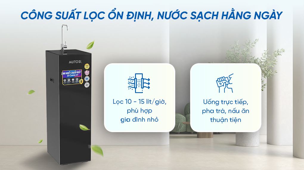Máy lọc nước RO Mutosi MP-S126 sở hữu hệ thống 10 lõi lọc tiên tiến, công suất mạnh mẽ 10 - 15 lít/giờ, cùng tỷ lệ thu hồi nước sạch 5:5 giúp tiết kiệm nước hiệu quả. Đây là lựa chọn đáng cân nhắc cho gia đình, văn phòng, cửa hàng cần một nguồn nước tinh khiết, an toàn, bổ sung khoáng chất có lợi cho sức khỏe.