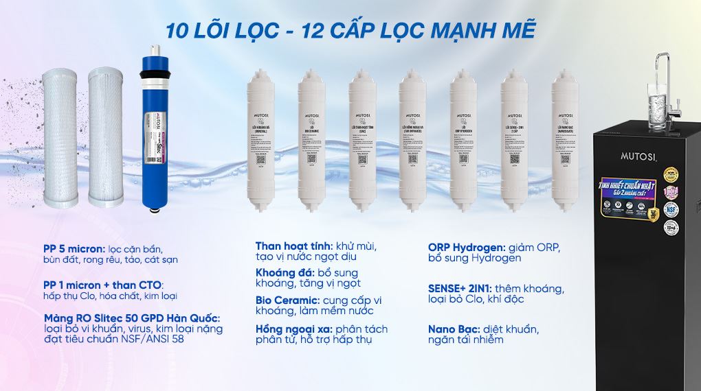 Hệ thống 10 lõi lọc giúp làm sạch nước tối ưu, đồng thời bổ sung khoáng chất có lợi cho sức khỏe: