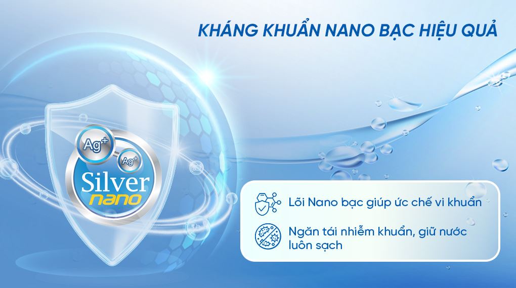- Công nghệ Nano Silver: diệt khuẩn, chống tái nhiễm khuẩn, giữ nước sau lọc luôn sạch.