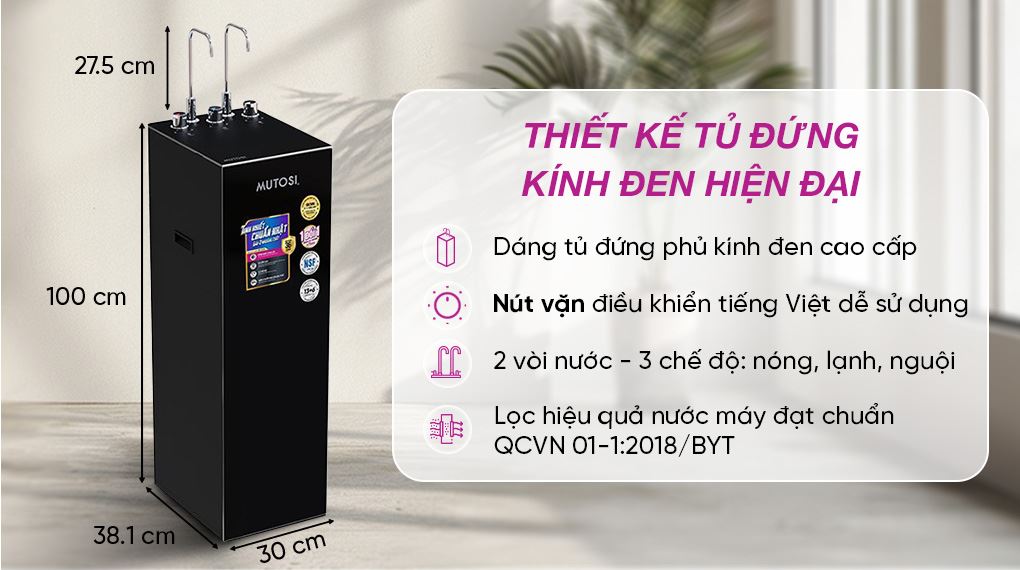 Máy lọc nước RO nóng nguội lạnh Mutosi MP-S129 10 lõi đạt chứng nhận QCVN 6-1:2010/BYT, đảm bảo nước đầu ra đạt chuẩn uống trực tiếp.