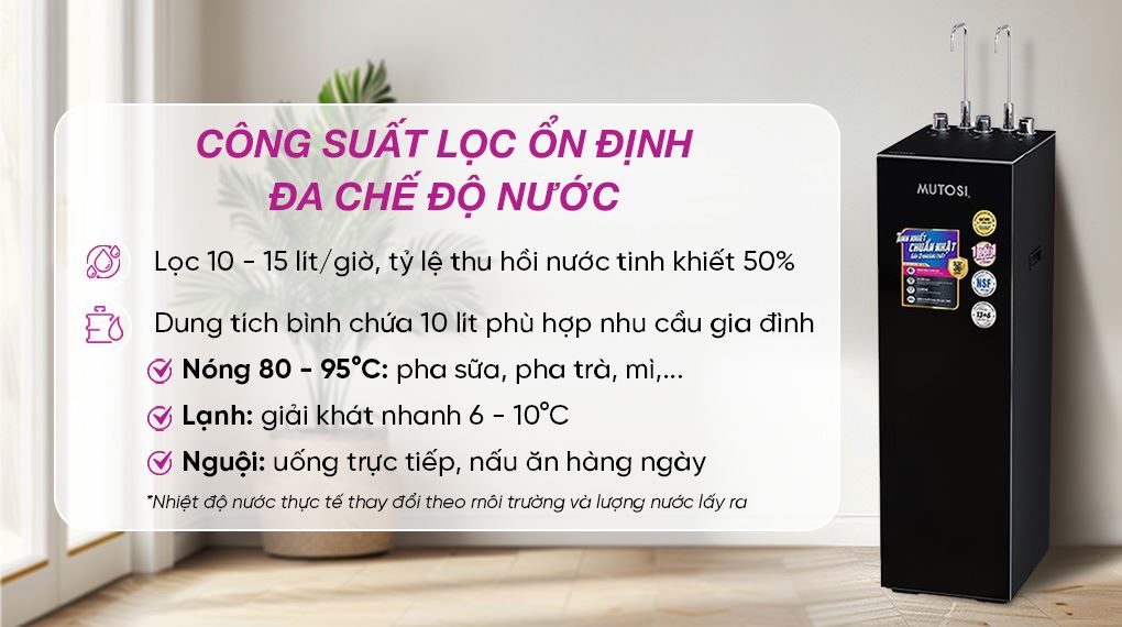 - Công suất lọc của máy lọc nước Mutosi từ 10 - 15 lít/giờ, đáp ứng nhu cầu sử dụng liên tục.