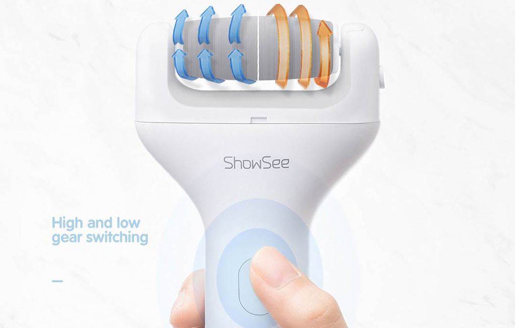 Máy mài gót chân Showsee có hai mức tốc độ: nhẹ cho vùng da mỏng, mạnh cho phần gót dày sừng. Chỉ cần nhấn nút để chuyển đổi.
