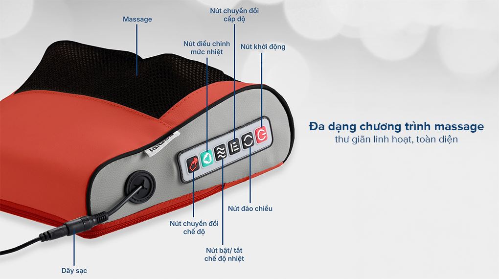 Máy massage được trang bị 3 chế độ cùng 3 mức điều chỉnh linh hoạt, cho phép người dùng dễ dàng lựa chọn cường độ phù hợp với nhu cầu thư giãn hay thả lỏng cơ bắp chỉ với vài thao tác nhấn nút. Thiết kế điều khiển đơn giản với một nút bấm giúp đảo chiều massage nhanh chóng, mang đến trải nghiệm massage linh hoạt, tiện lợi và thoải mái cho nhiều vùng cơ thể.