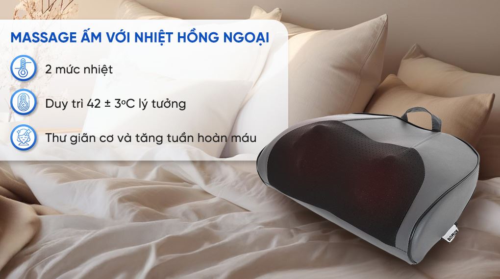 Massage ấm bằng nhiệt hồng ngoại với 2 mức nhiệt khác nhau. Ngay cả ở mức nhiệt cao, sản phẩm vẫn không gây nóng rát, khó chịu. Chế độ chườm nóng duy trì ở mức nhiệt lý tưởng khoảng 42 ± 3ºC, tăng hiệu quả thư giãn và lưu thông máu.