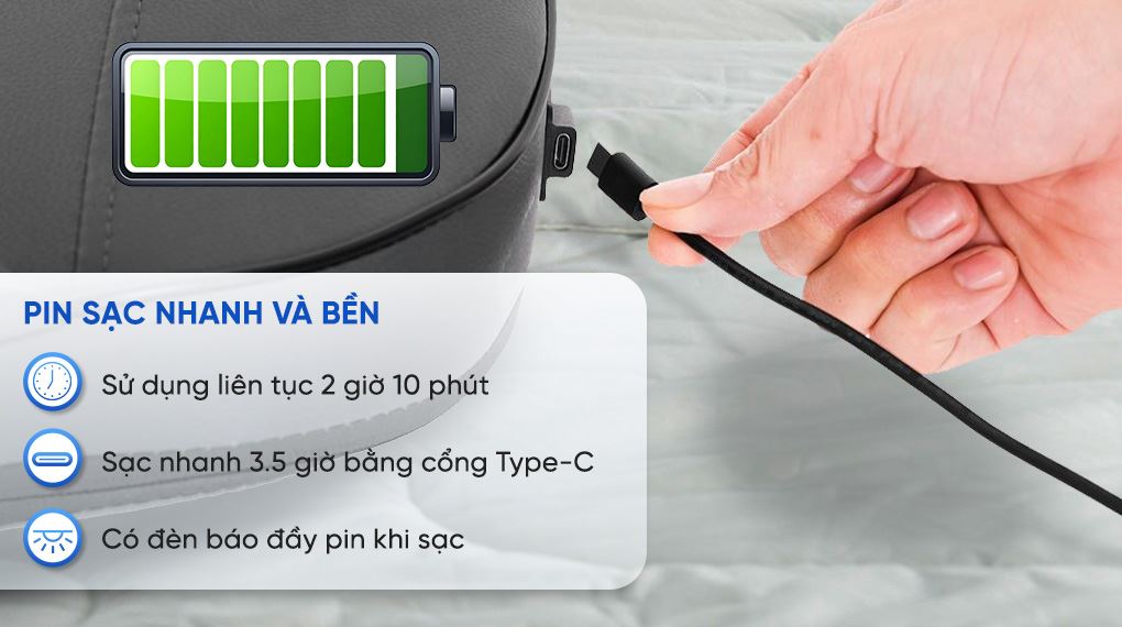 Thời gian sạc khoảng 3.5 giờ cho thời lượng dùng khoảng 2 giờ 10 phút, đủ để massage nhiều lần trong ngày. Đèn báo pin thông minh giúp bạn chủ động kiểm soát dung lượng, tránh gián đoạn khi đang sử dụng.