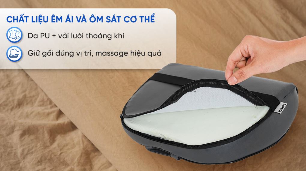 Bề mặt phủ da PU kết hợp vải lưới thoáng khí, chất liệu vừa chắc chắn vừa mềm mại khi tiếp xúc, đảm bảo sự thông thoáng trong suốt quá trình sử dụng. Thiết kế công thái học với các đường cong ôm sát vùng đầu, cổ và cơ thể, giúp giữ gối đúng vị trí và tăng hiệu quả massage.