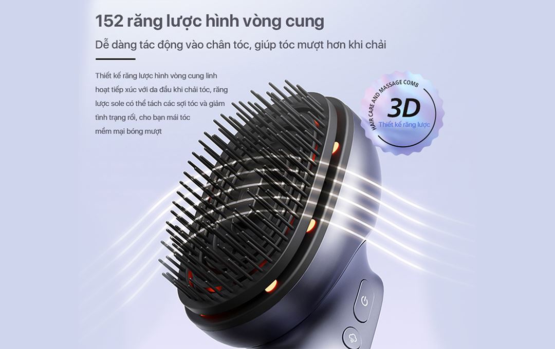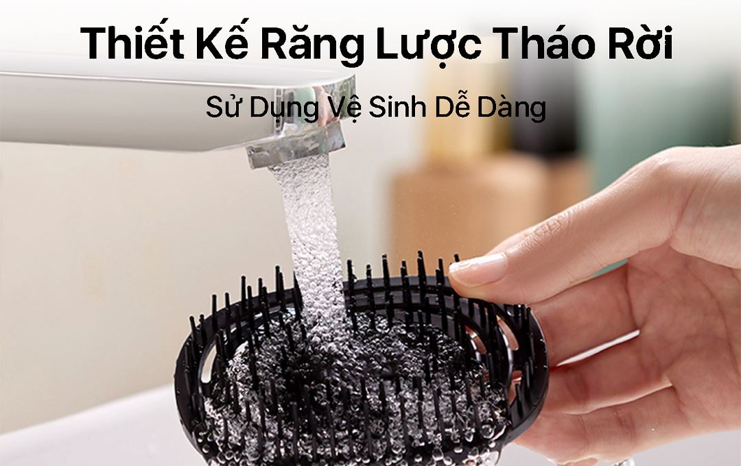 - Lược massage có 152 răng lược hình cung tiếp xúc đều lên da đầu, giúp gỡ rối nhẹ nhàng đồng thời kích thích các huyệt massage một cách tự nhiên. Phần răng lược có thể tháo rời để vệ sinh.