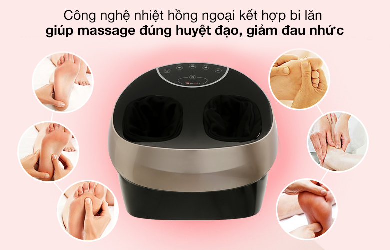 Tác dụng dò tìm và bấm huyệt đạo chính xác, ấn huyệt tại vùng 60% diện tích bàn chân từ đầu ngón chân với gót chân. Nhiệt hồng ngoại của máy massage chân được truyền qua các sợi cacbon, tích hợp ngay tại đầu của các bi lăn và tỏa nhiệt ra liên tục khi bi lăn hoạt động.