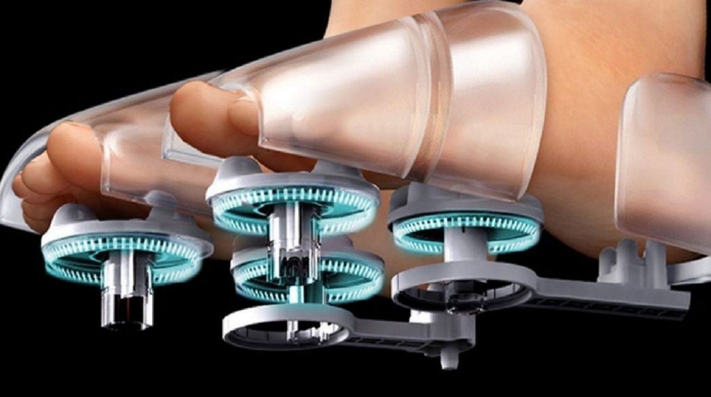 Sản phẩm kết hợp 2 phương pháp massage phổ biến là con lăn và túi khí, hướng đến giảm căng cứng và mỏi cơ vùng bàn chân sau khi đứng lâu hoặc đi lại nhiều.