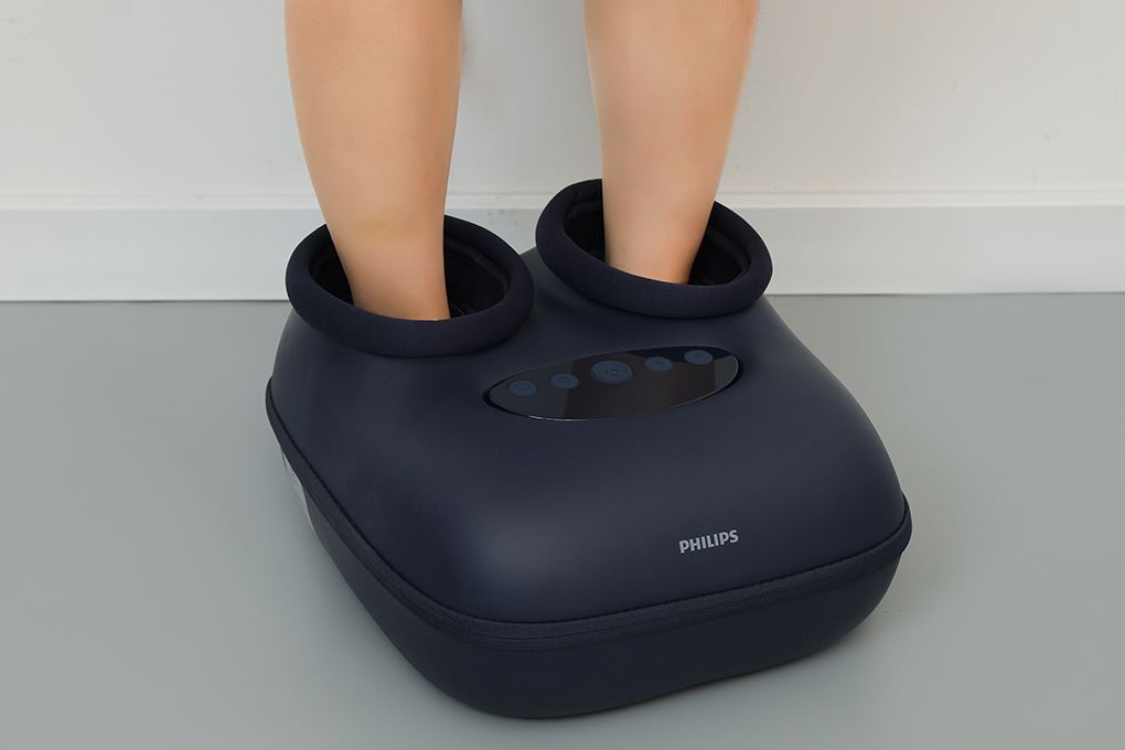 Máy massage chân Philips PPM6333 hỗ trợ thư giãn bàn chân hiệu quả với con lăn, túi khí và chườm nóng, phù hợp sử dụng hằng ngày sau khi đứng hoặc đi lại nhiều.