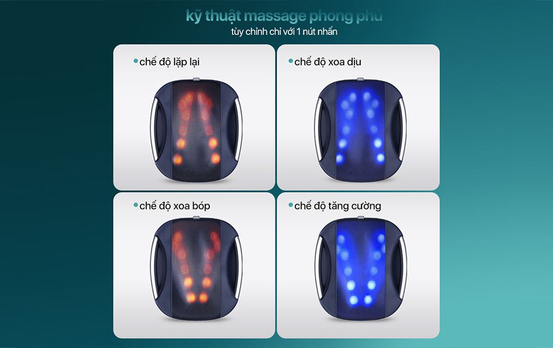 Máy tích hợp 4 chế độ massage gồm: lặp lại, xoa dịu, nhào bóp và tăng cường. Các chế độ này được thiết lập sẵn, dễ dàng chuyển đổi chỉ bằng một nút nhấn, giúp bạn linh hoạt điều chỉnh theo cảm giác và nhu cầu từng thời điểm.