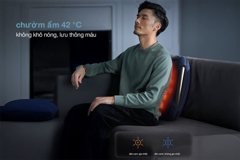 Chức năng chườm nóng với mức nhiệt cố định 42°C giúp cải thiện lưu thông máu, làm dịu nhanh cảm giác đau nhức và sưng cơ. Việc kết hợp giữa xoa bóp và nhiệt trị liệu mang lại hiệu quả thư giãn sâu và hỗ trợ hồi phục cơ bắp rõ rệt.