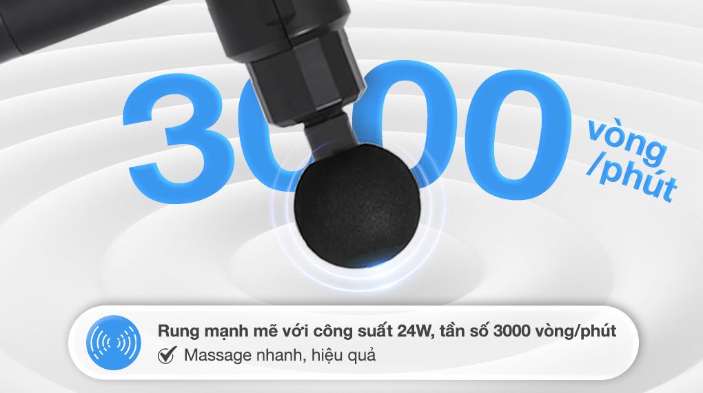 Lực rung mạnh 3000 vòng/phút trong một thiết kế nhỏ gọn và tiện dụng, mang lại trải nghiệm thư giãn cơ bắp hiệu quả mọi lúc, mọi nơi.