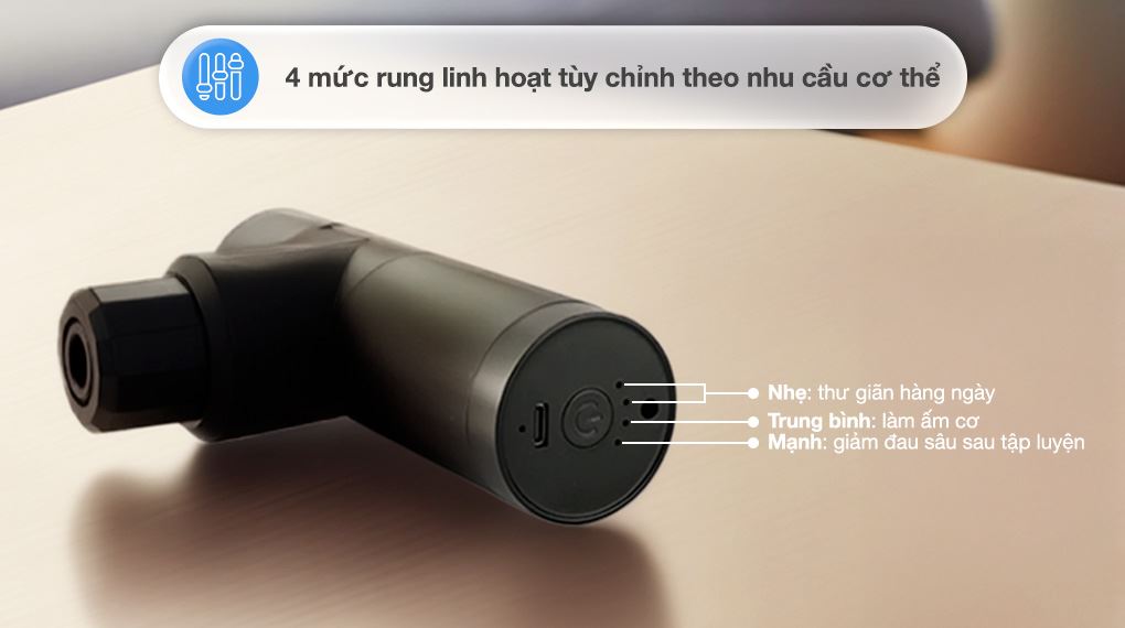 Lực rung mạnh nhưng vẫn rất êm, không gây cảm giác tê hay khó chịu. Với 4 cấp độ massage khác nhau, bạn có thể linh hoạt chọn: