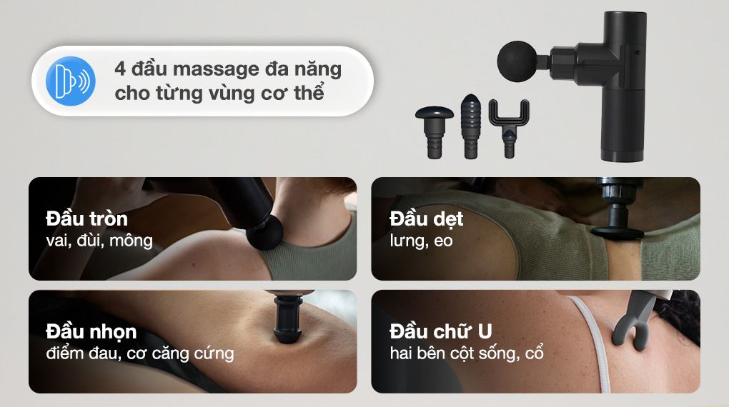 Các đầu massage dễ tháo lắp, gắn khớp chắc chắn, không bị lỏng hay lệch ngay cả khi sử dụng ở cường độ cao. Bạn có thể tùy chỉnh linh hoạt đầu massage tùy vùng, giúp trải nghiệm trọn vẹn hơn - từ thư giãn cơ cổ vai gáy cho tới massage bắp chân, đùi sau khi tập gym.