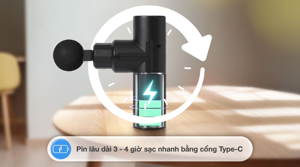 Máy massage cá nhân sử dụng pin dung lượng lớn, cho thời gian hoạt động 3 - 4 giờ liên tục và sạc đầy trong khoảng 3 - 4 giờ. Pin duy trì khá ổn nếu mỗi ngày massage 15 - 20 phút, bạn chỉ cần sạc vài lần trong tuần.