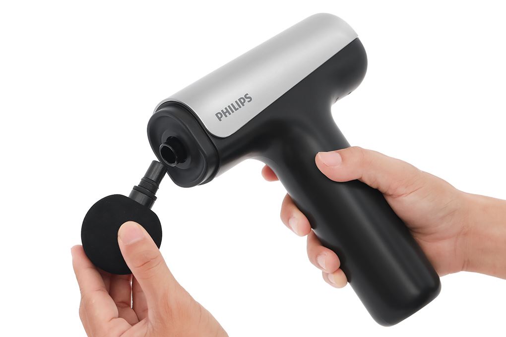 Súng massage Philips PPM7325 nhỏ gọn, dễ sử dụng với 6 đầu massage đi kèm, lực đẩy đến 8 kg và biên độ 8 mm, hỗ trợ thư giãn và giảm mỏi cơ toàn thân hiệu quả.