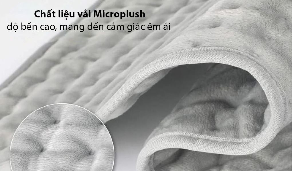 Bên ngoài thảm sử dụng chất liệu vải Microplush có độ bền cao, mang đến cảm giác êm ái khi sử dụng, bên trong có các lớp vải không dệt Nonwoven cách điện, thoáng khí giúp hơi nóng được truyền nhanh và an toàn hơn cho người dùng.