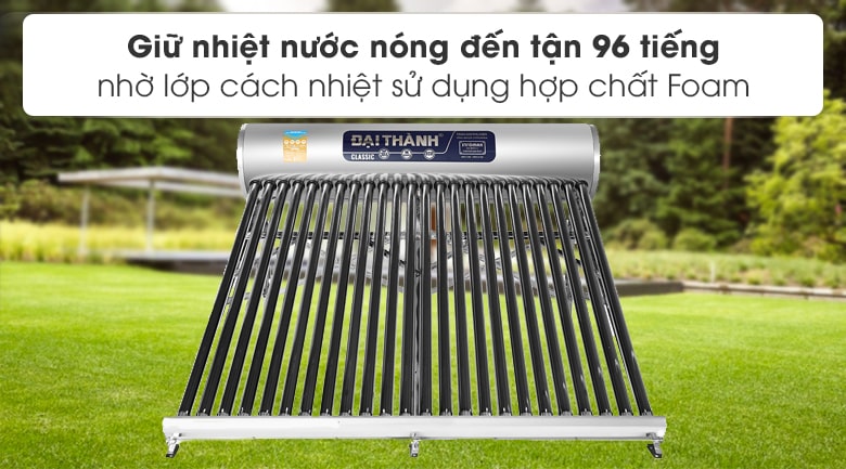Máy nước nóng Đại Thành này có lớp cách nhiệt với chất liệu là hợp chất Foam làm nước được nén chặt, giữ nhiệt độ nước lên tới 96 giờ giúp đảm bảo nhiệt độ nước trong những ngày mưa không có ánh nắng hoặc trời nắng ít.