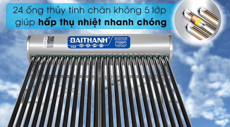 Máy nước nóng năng lượng mặt trời Đại Thành 250 lít Vigo 58-24 là sản phẩm đáp ứng tốt nhu cầu của người sử dụng, bảo vệ môi trường, tiết kiệm điện và mang lại nhiều lợi ích khi sử dụng lâu dài.