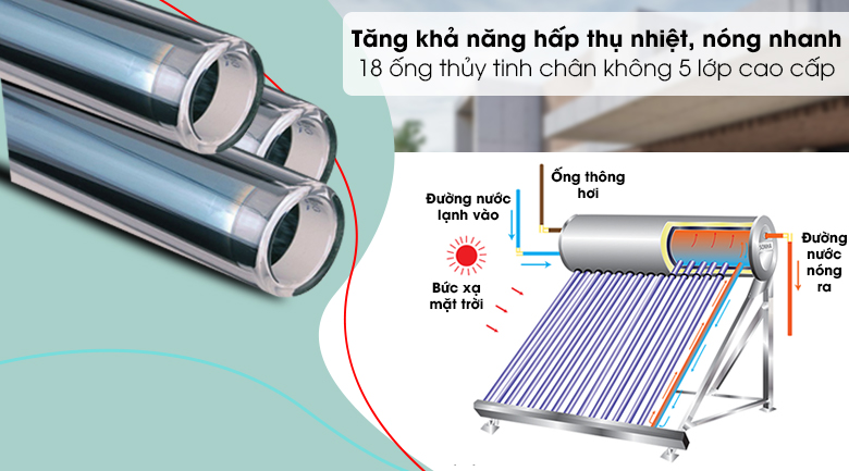 Máy nước nóng năng lượng mặt trời này được trang bị 18 ống thủy tinh chân không 5 lớp dài 1.8m giúp tăng khả hấp thụ nhiệt và ánh sáng mặt trời. Thời gian đun nóng nước chỉ 2.5h - 3h trong điều kiện đủ nắng.