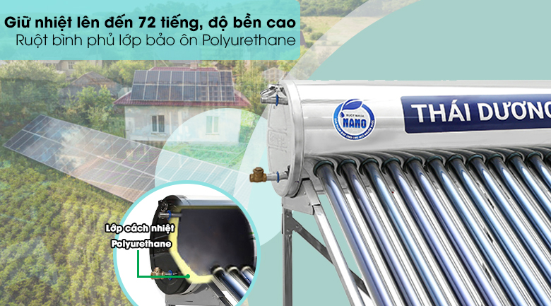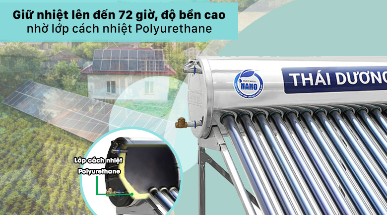 Đảm bảo lượng nước nóng lâu ở điều kiện thời tiết nắng ít hay yếu, duy trì trong thời gian 72 giờ nhờ lớp cách nhiệt từ hợp chất Polyurethane của máy nước nóng năng lượng mặt trời Sơn Hà.