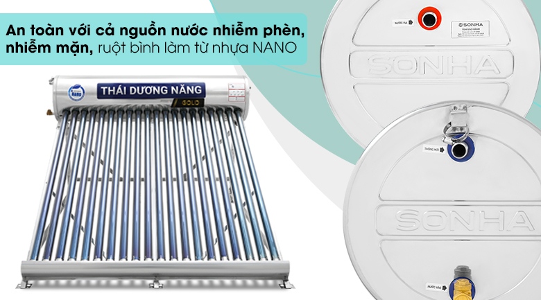 Máy nước nóng năng lượng mặt trời Sơn Hà 200 lít Nano 58-200 làm nóng bằng năng lượng mặt trời thân thiện với môi trường nhưng hiệu suất đem lại vẫn cao, không tốn bất kì chi phí điện nào.