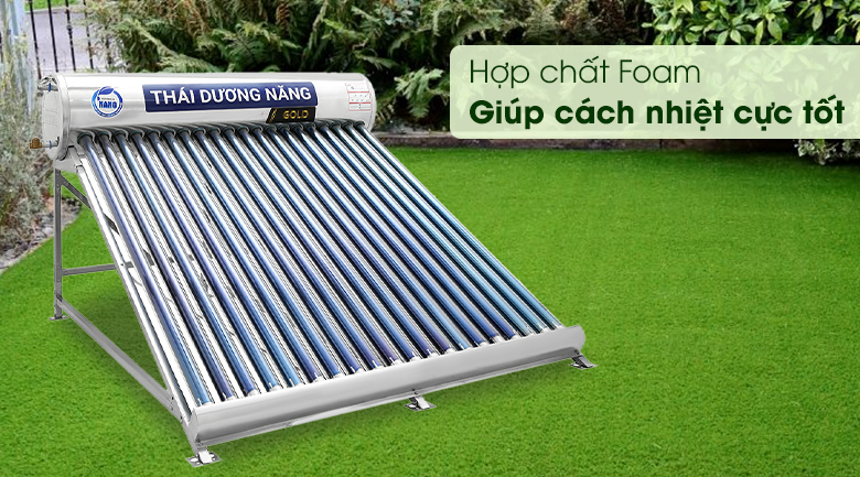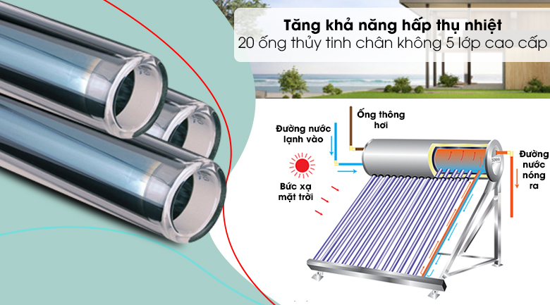 Trên máy nước nóng năng lượng mặt trời này trang bị 20 ống chân không 5 lớp chiều dài 1.8m cho khả năng hấp thụ nhiệt tốt, quá trình chuyển hóa nhiệt liên tục giữa ống và bình bảo ôn cho nước nóng liên tục.