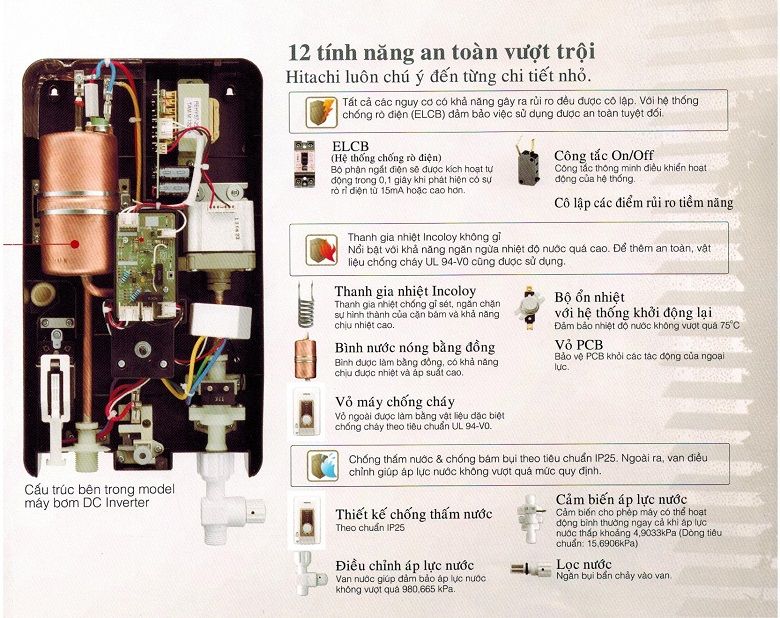 Máy nước nóng Hitachi còn được nhà sản xuất trang bị bộ chống rò rỉ điện ELCB cực nhạy, nhanh chóng ngắt điện chỉ trong vòng 0.1 giây khi có dấu hiệu rò rỉ điện 15mA hoặc cao hơn, đem đến cho bạn sự an toàn và cảm giác thật sảng khoái khi sử dụng (Xem thêm Các chế độ an toàn trên máy nước nóng).
