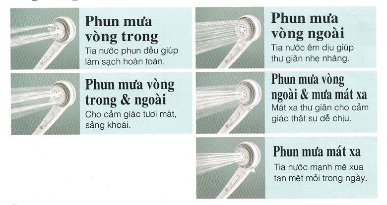 Vòi sen được tích hợp 5 chế độ phun cho bạn sự chọn lựa phù hợp với sở thích của riêng mình. Đồng thời, sản phẩm còn có tính năng chống khuẩn vòi sen kết hợp với bộ lọc nước mang lại cho bạn những dòng nước thực sự sạch khuẩn và an toàn cho làn da của bạn.
