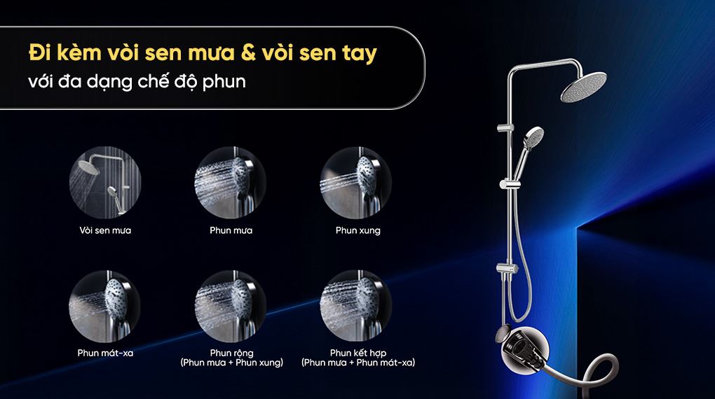 Máy có 2 vòi sen đi kèm: 1 vòi sen tay với 5 chế độ phun và 1 vòi sen mưa, đáp ứng đa dạng nhu cầu như thư giãn, massage hay tắm nhanh hằng ngày.