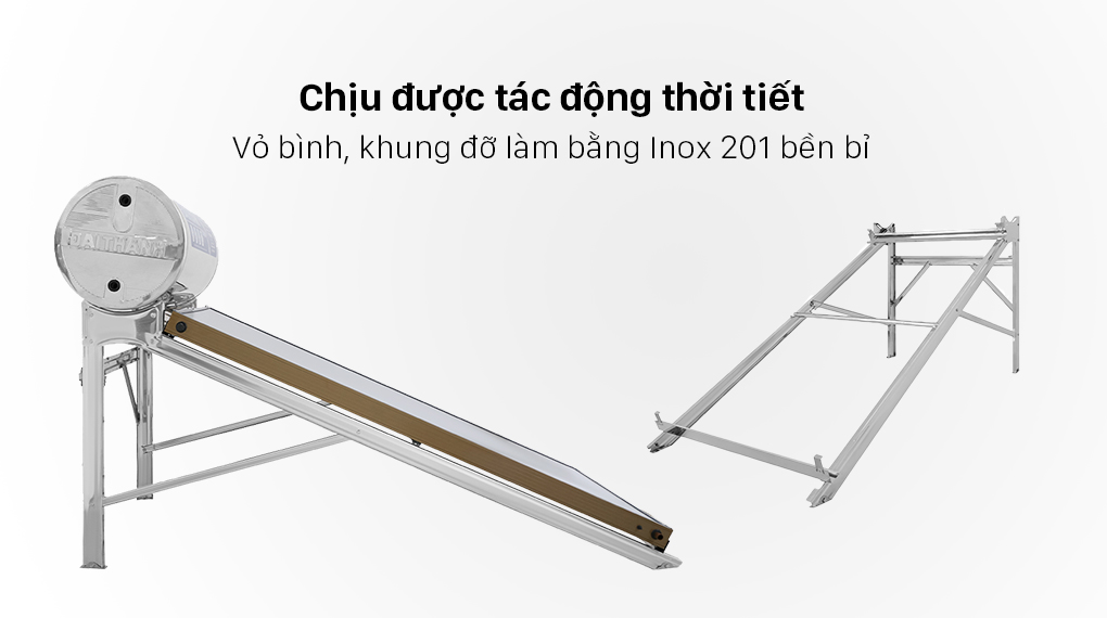 Chính bởi vì máy nước nóng năng lượng mặt trời phải đặt ở ngoài trời nên vật liệu phải đảm bảo độ chống chịu tốt. Ở đây, nhà sản xuất chọn inox 201 để làm vỏ bình, khung đỡ. Được biết thì inox 201 có thể chịu được tốt những tác động của thời tiết thay đổi. Nhờ vậy giúp nâng cao tuổi thọ của máy phần nào.